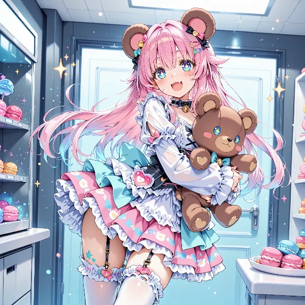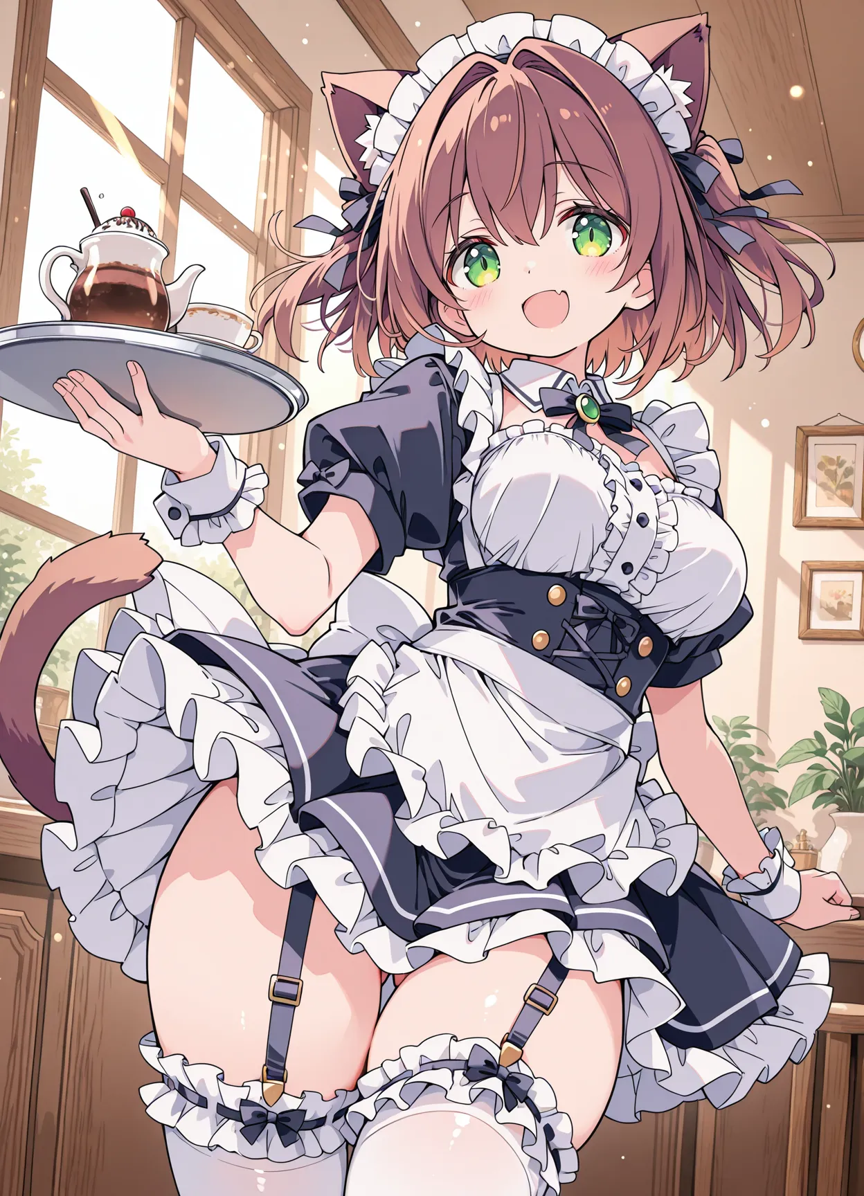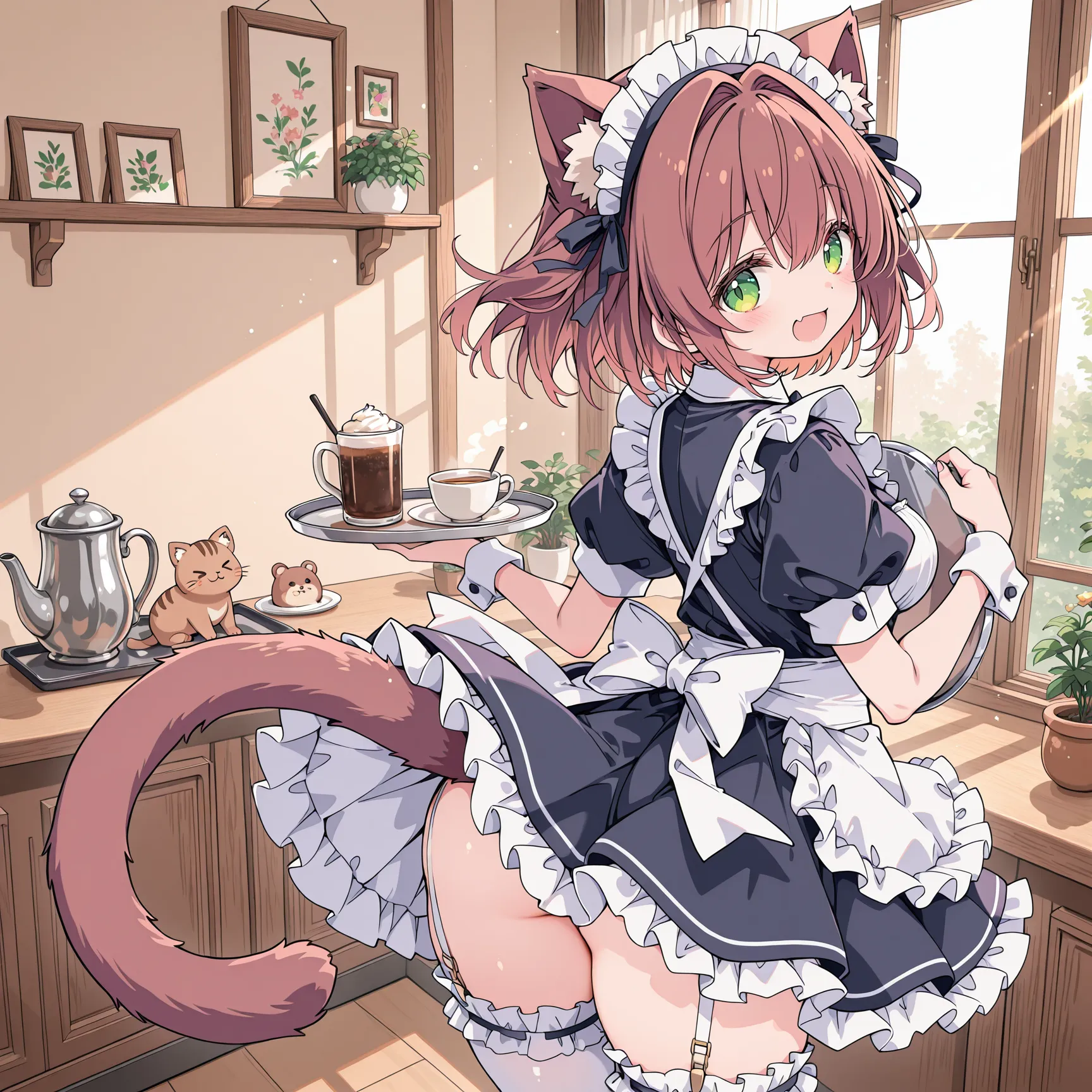 In a bright cafe, a cat-eared maid carries beer mugs. Her green eyes sparkle, and her smile warms the room. The fluffy skirt sways gently, creating a joyful atmosphere.