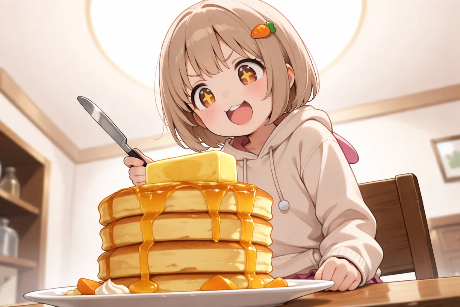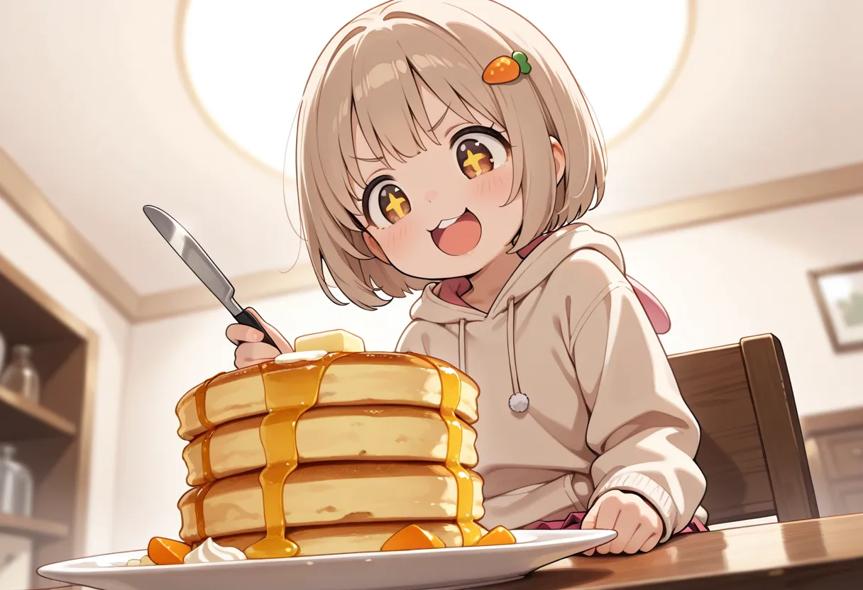 チャッピー先生に計算してもらいました。 ■ カロリー計算 ● パンケーキ(4枚) 1枚 約200 kcal →👉 約800 kcal ● バター(1本 200g) バターは100gあたり約745 kcal →👉 約1,490 kcal ● メープルシロップ(多めに約80g) 👉 約210 kcal ● ホイップクリーム(少量) 👉 約100 kcal ■ 合計 👉 約2,600 kcal 女児1日分の目安1,300 kcalと仮定すると2日分ですね🤤