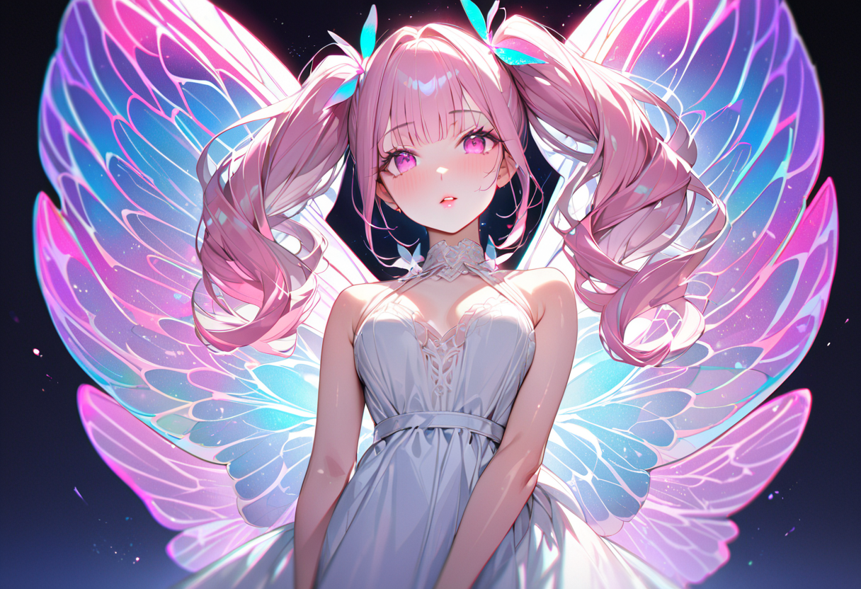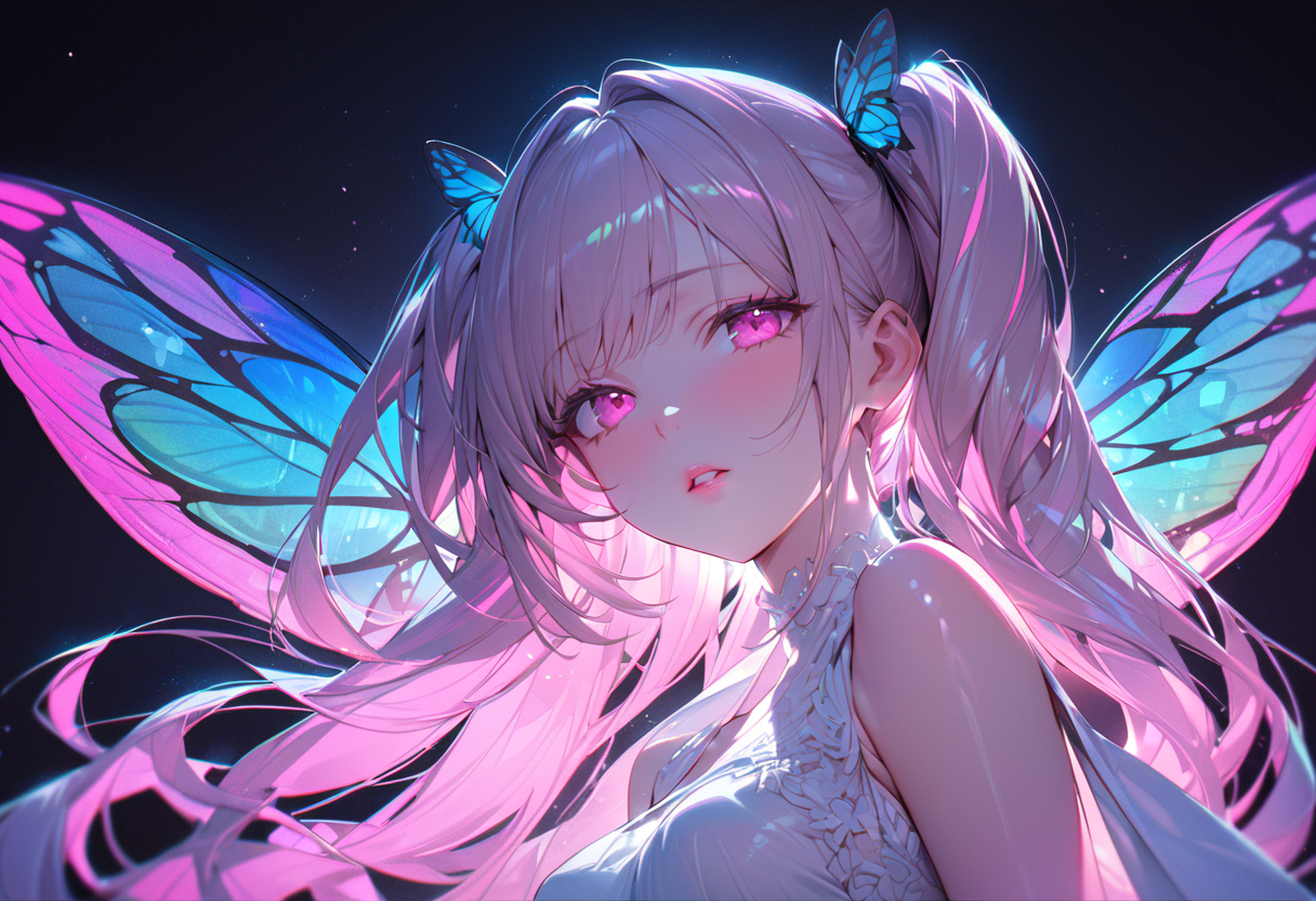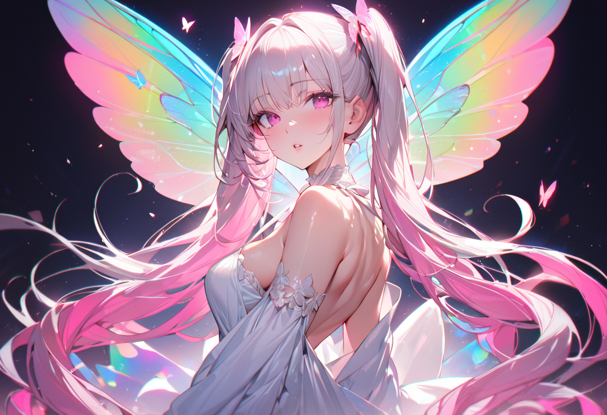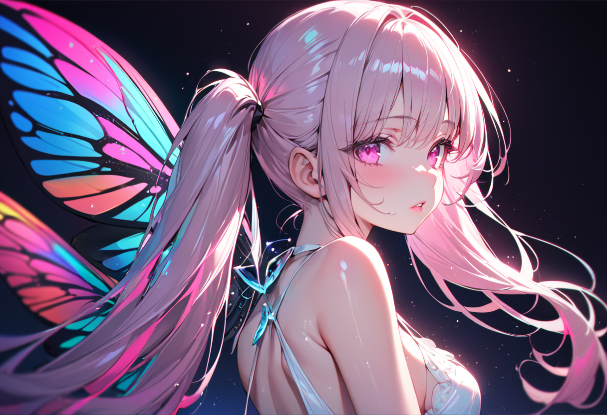 写真撮ると蛍光ネオンレインボーな蝶の羽根が出てくる、的な。