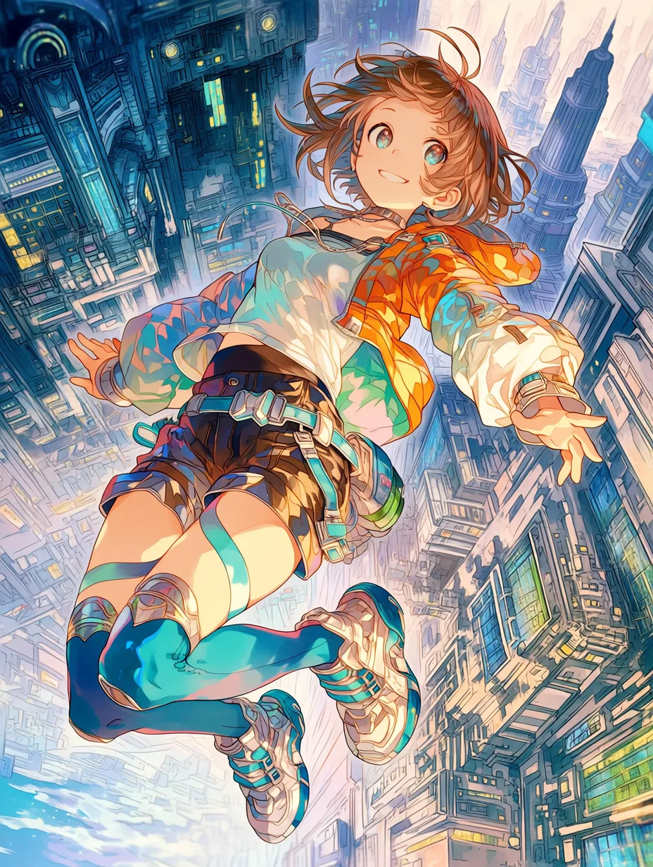 In the skies above a sprawling futuristic city of towering skyscrapers, a girl leaps boldly, her yellow jacket fluttering in the wind. Equipped with a secret flying device, she escapes the hustle of daily life, embracing the thrill of adventure as she slices through the air. Below, a blue lake and green parks stretch out, freeing her spirit. Is this daring jump the start of a new discovery, or just a rush of excitement? Her story soaring through the urban sky holds endless possibilities.