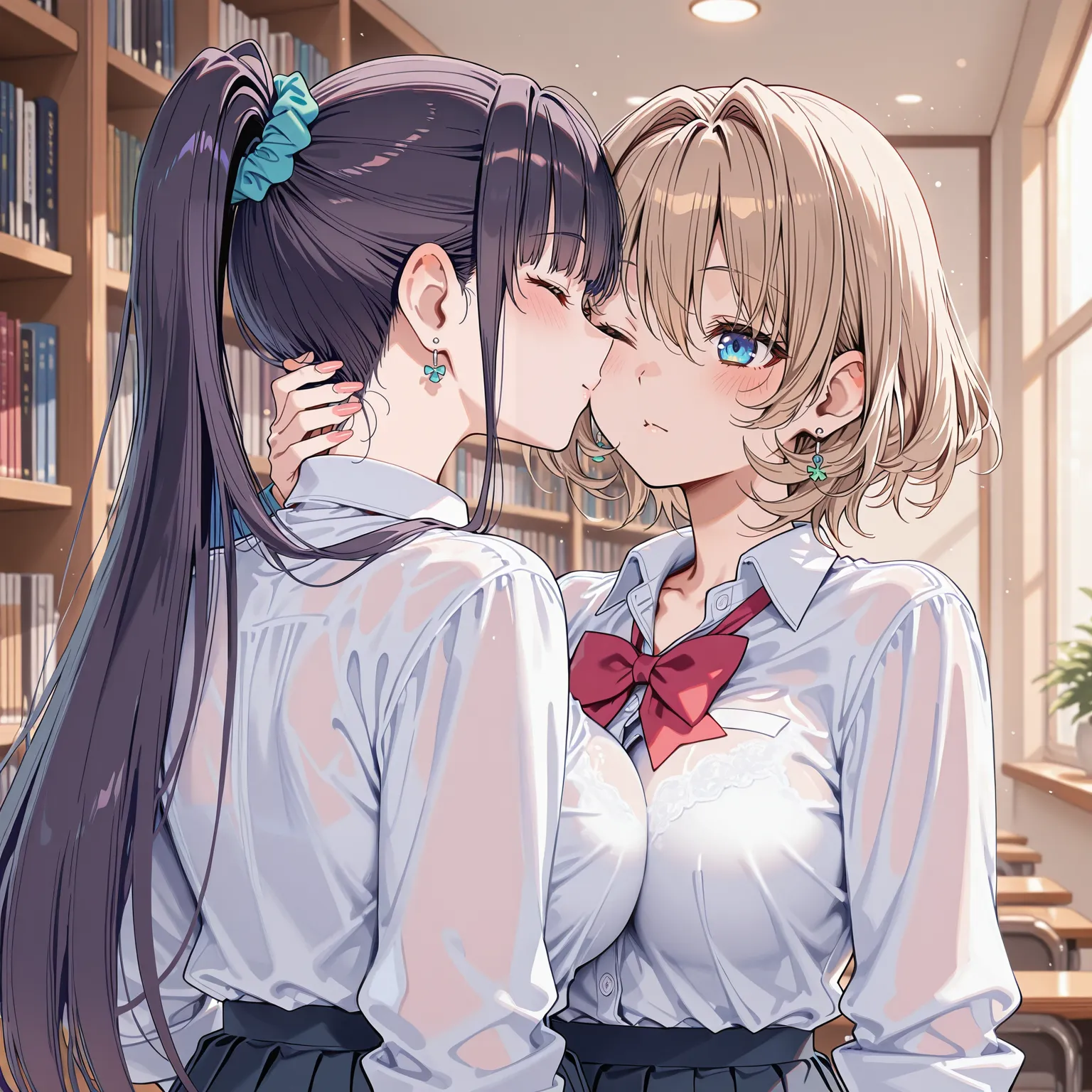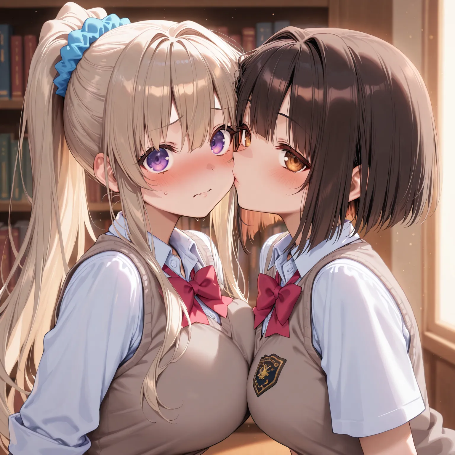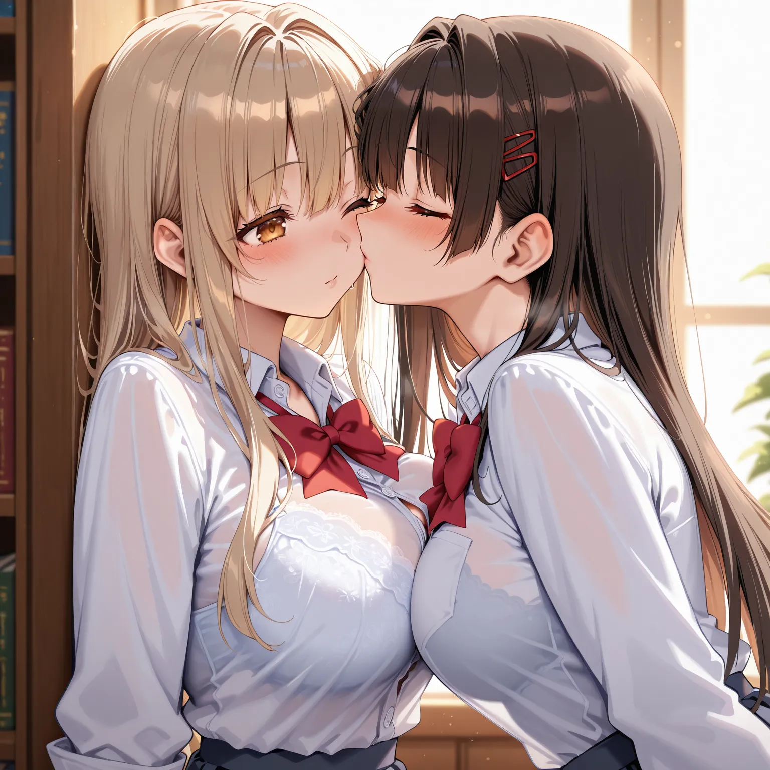 In the soft light surrounded by bookshelves, two girls gently press their lips together. Their blushing cheeks and sweet gazes stir the heart.