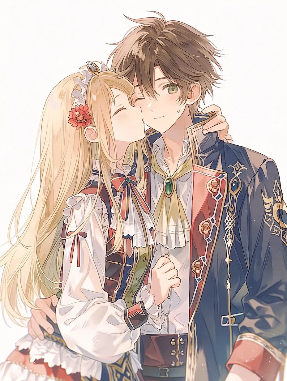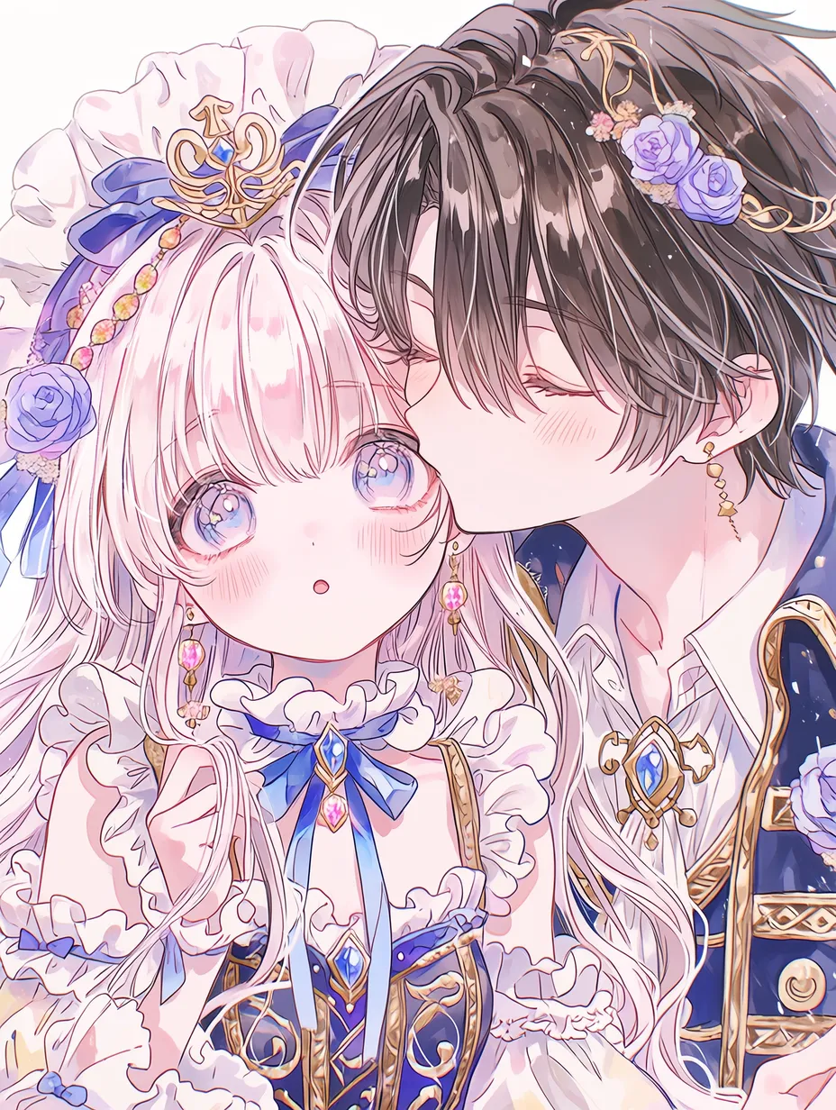 In the ancient castle garden, with gentle winds scattering petals, a blonde princess adorned with a flower crown gently kisses her loyal knight. Overcoming days of battle, they pledge eternal love in this moment. Hope shines in her eyes, and his arms tenderly embrace her. Could this encounter mark the start of a new adventure? It evokes a warm story in the reader's heart.