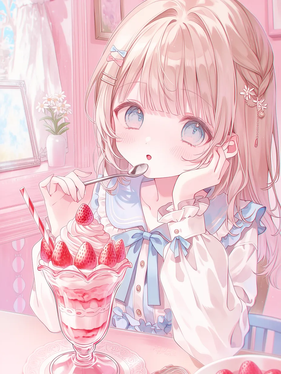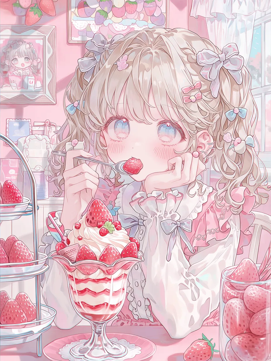 In a pink room, a girl in a fluffy dress dips her spoon into a large strawberry parfait. Soft light from the window makes her blue eyes sparkle. Today, she's having a secret tea party with her favorite toys. The sweet and tangy taste of strawberries turns her ordinary day into a special adventure. Her happy smile on her cheeks spreads a sweet aroma throughout the room. Perhaps this moment is a magical time that could last forever.