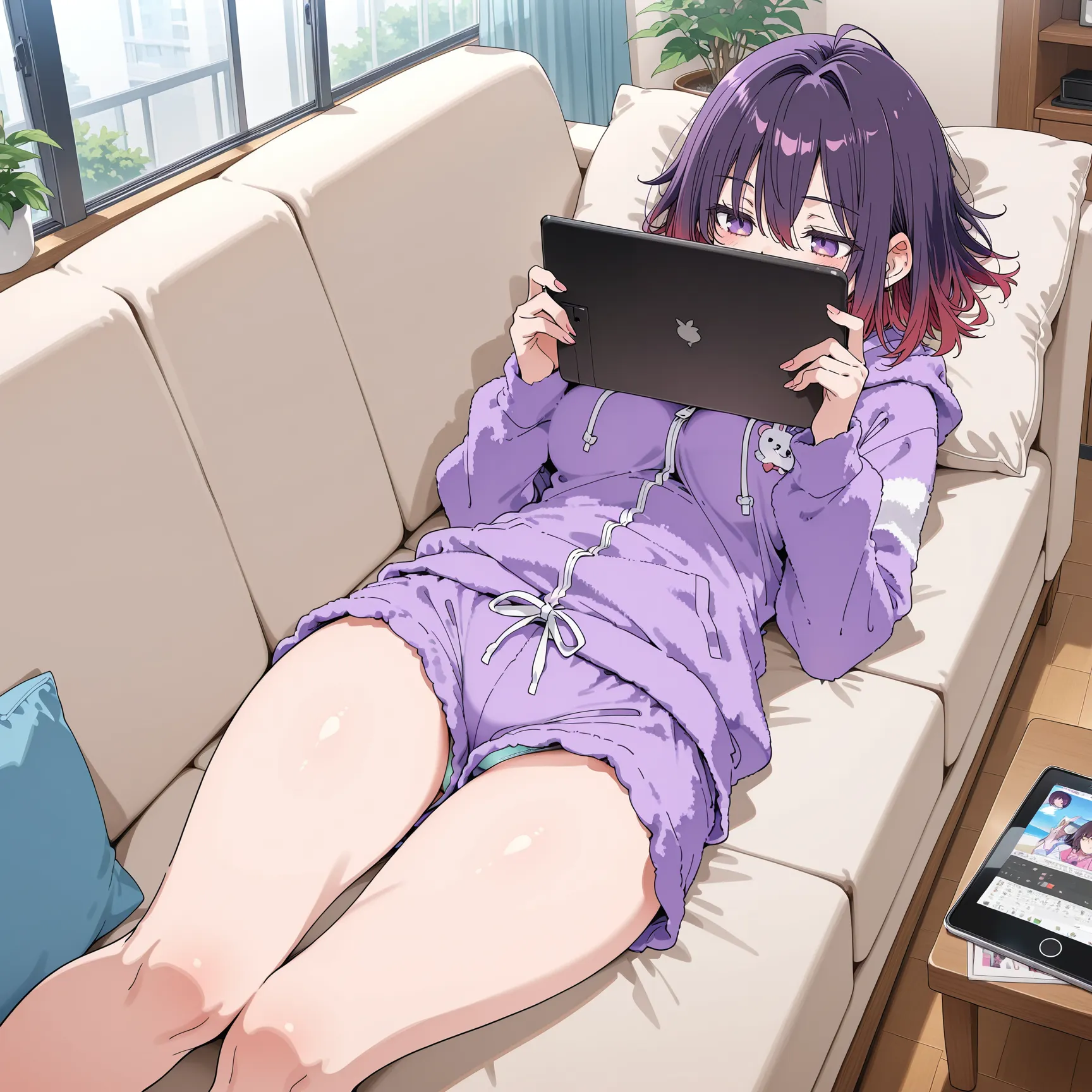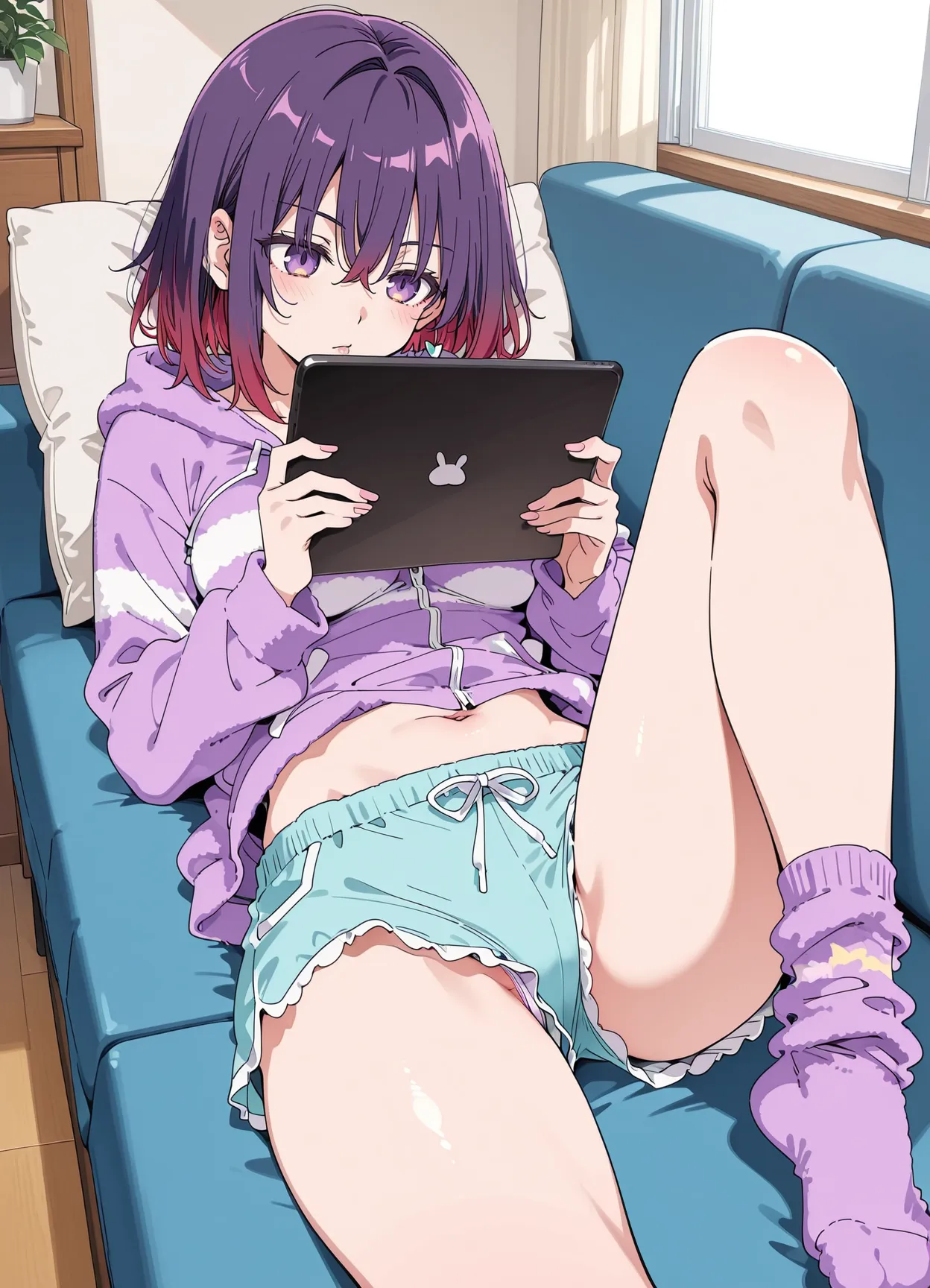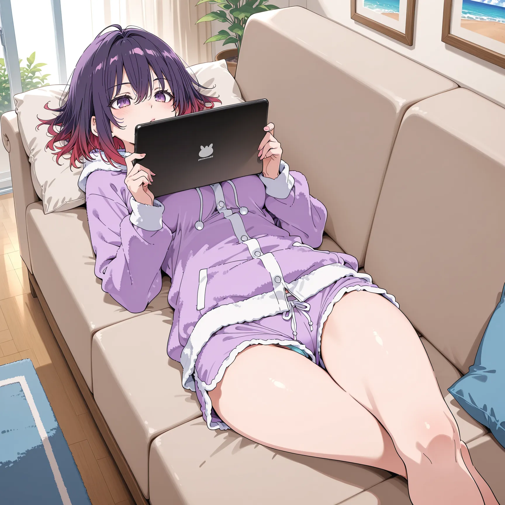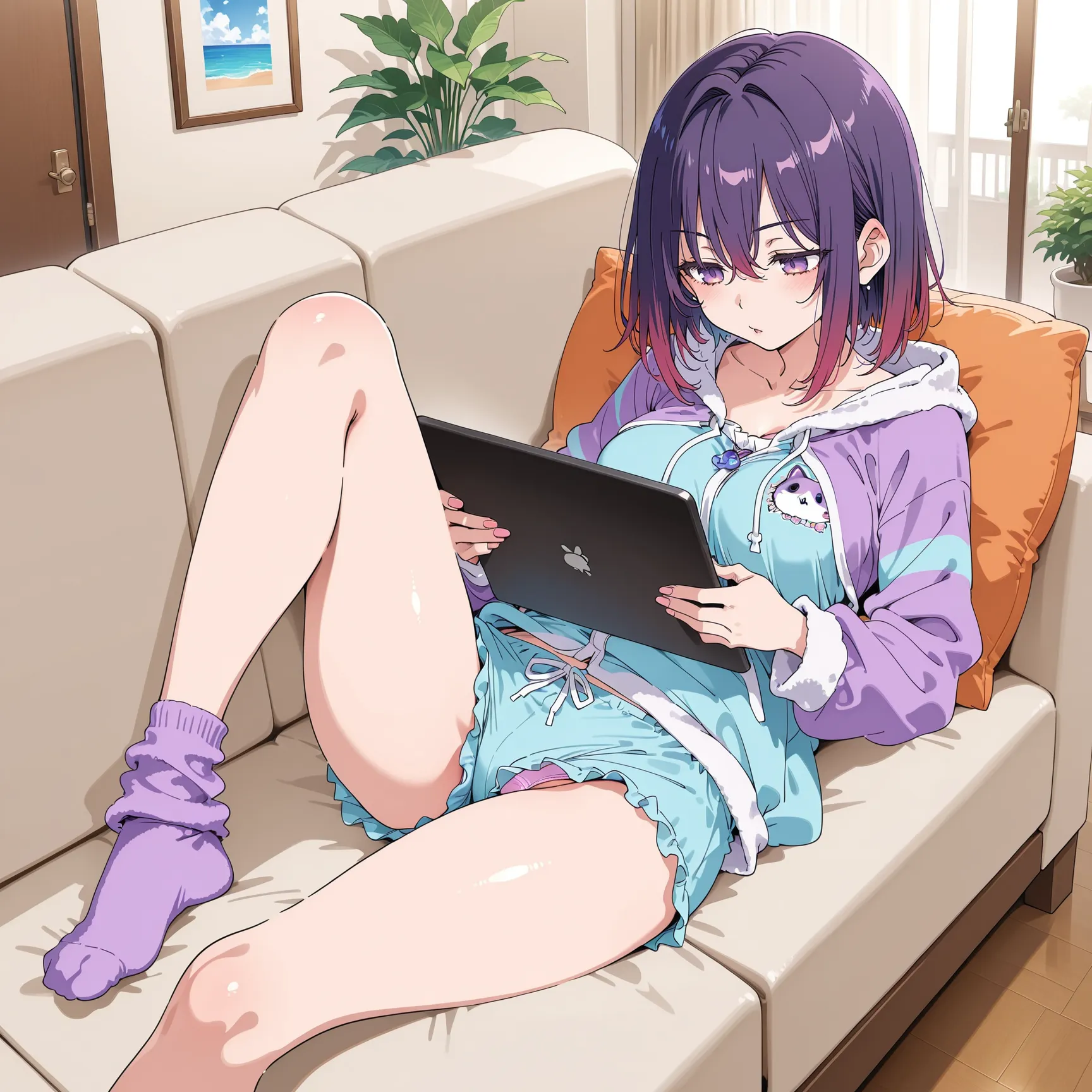 A purple-haired girl lounges on the sofa, focused on her laptop. Soft sunlight fills the room, creating a calm and relaxing vibe.