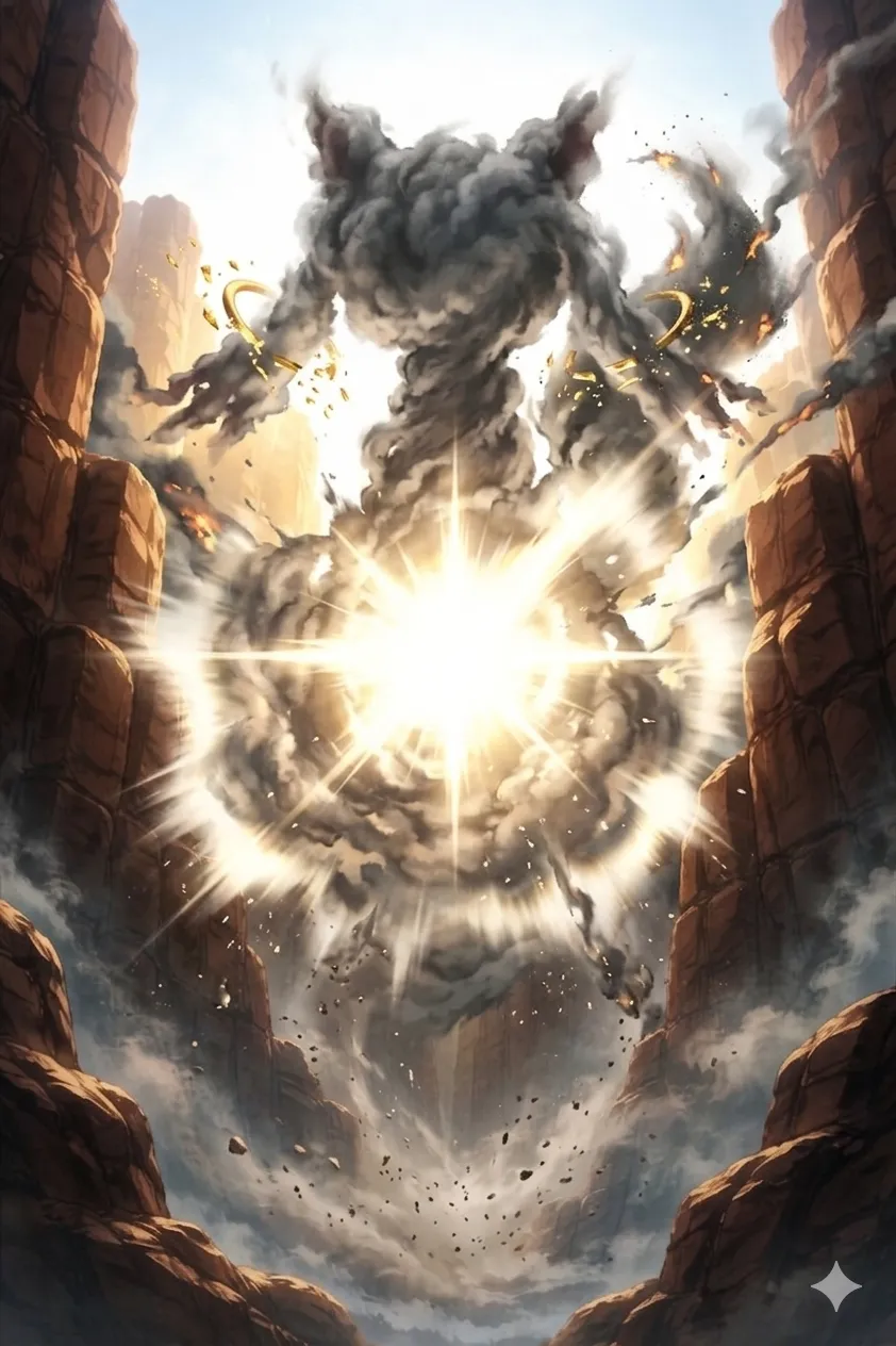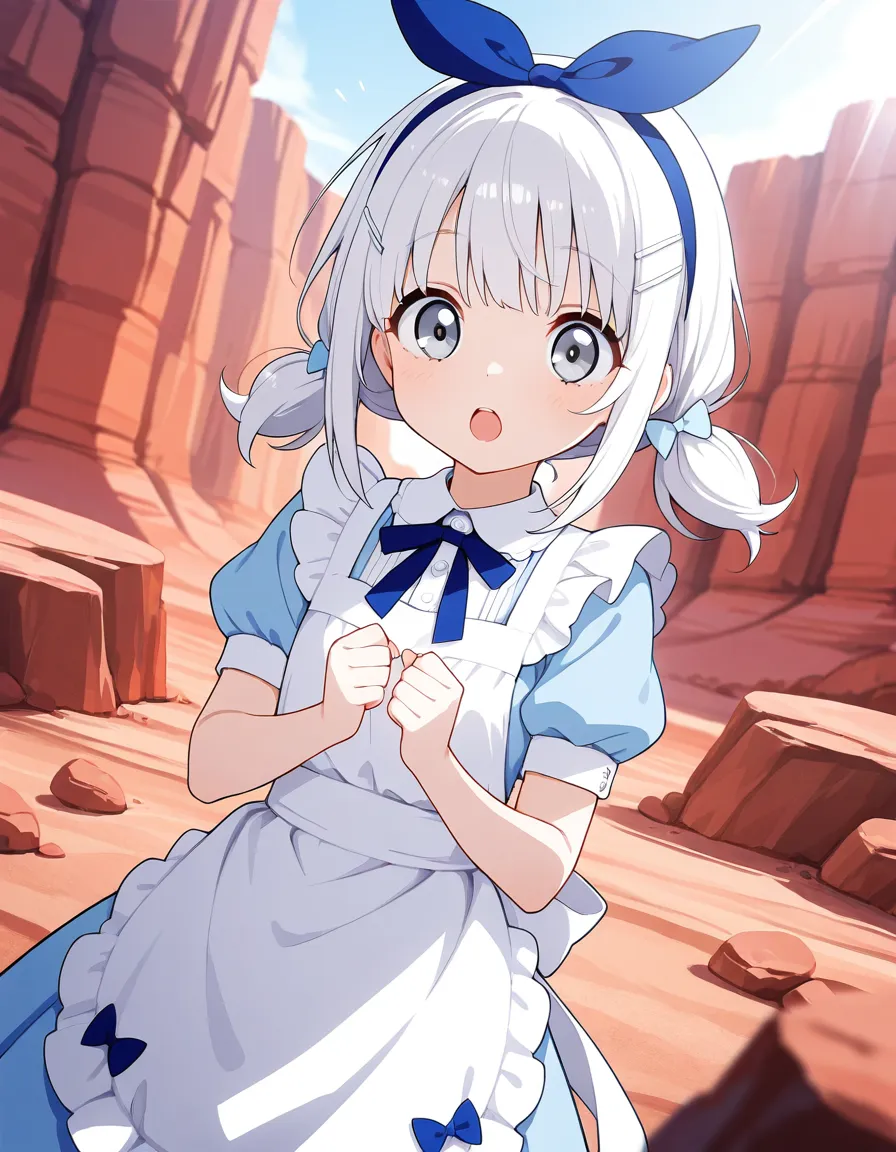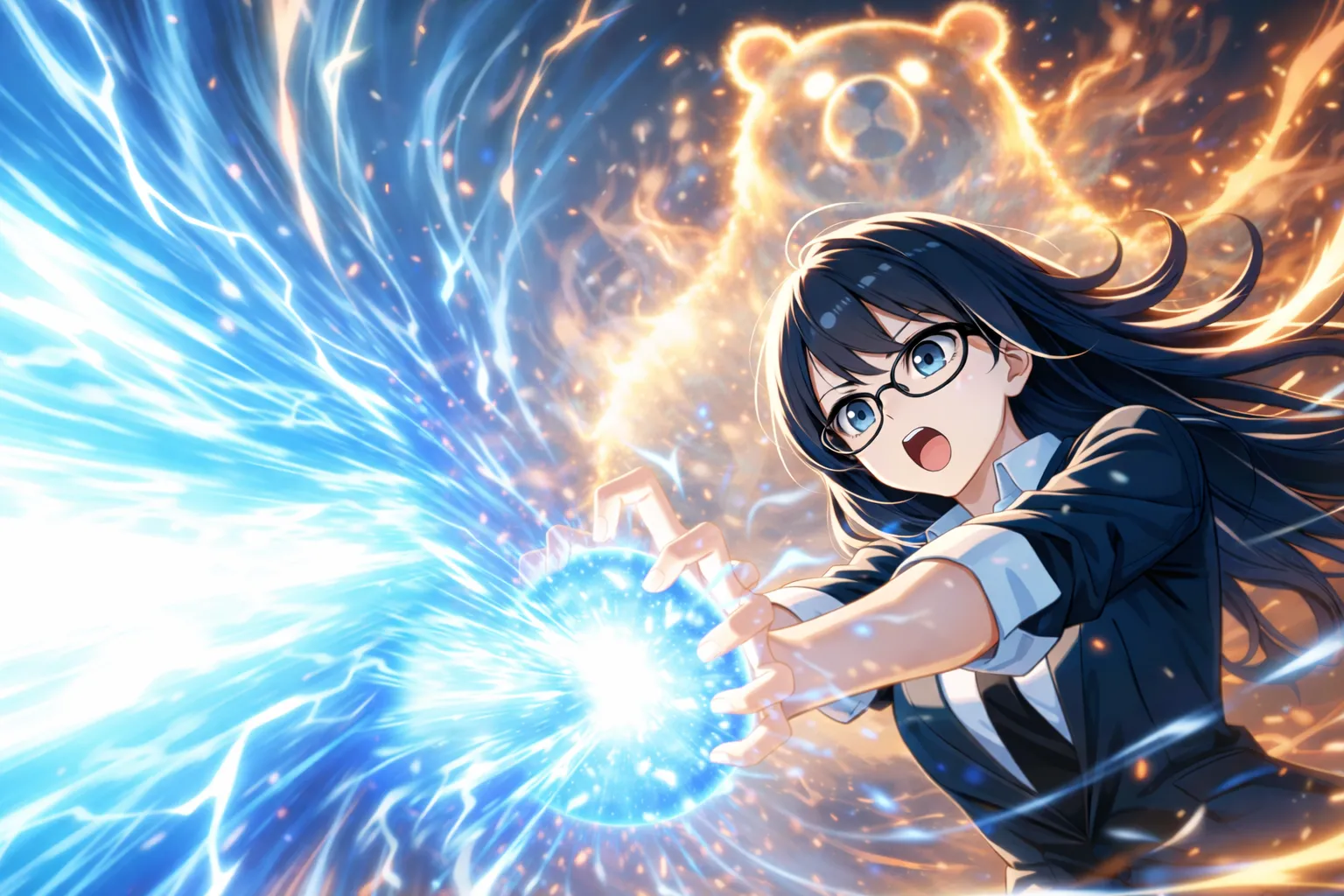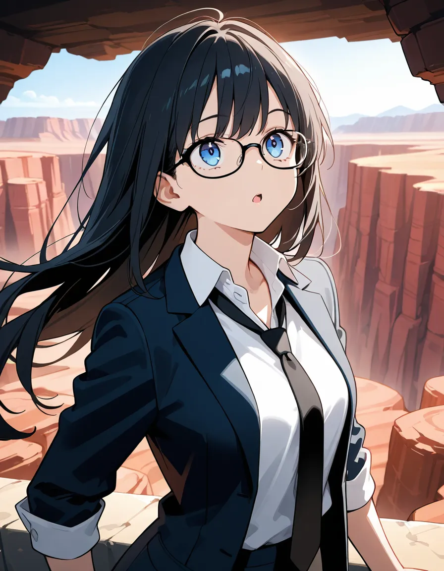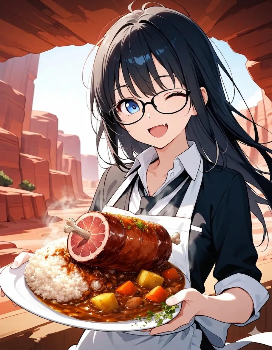parameters: ((masterpiece)), ((best quality)), (ultra-detailed), ((kawaii)), cute, (lovely), animated style illustration, (majestic canyon landscape:1.5), outdoor, (solo), 1girl, cute girl, (beautiful blue eyes), (beautiful black hair), (long hair), slim, slender, (glasses), medium breast, (refreshing smile:1.3), (winking:1.2), (one eye closed), open mouth, (fang), wearing a black suit (black jacket and black slacks), (white collared shirt:1.2), (open collar:1.5), (loosened black necktie:1.2), (sleeves rolled up:1.3), (white apron:1.5), (Holding out a plate of curry rice with both hands:1.5), surrounded by exaggerated rock formations, mystical atmosphere, soft wind blowing her hair and clothes, cinematic composition, eye-level angle, depth of field, soft sunlight, delicate lighting, messy hair strands, (dynamic action pose), high resolution, sharp focus, (happy atmosphere:1.3), upper body, from below.