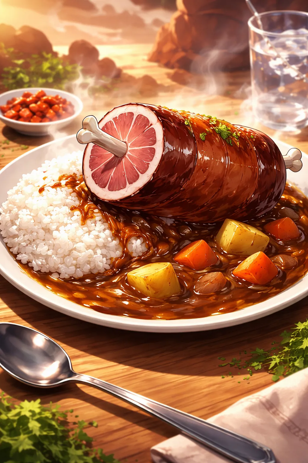 キャプションの中では語る余裕がありませんでしたが、巨大な塊から一部を切っても、7枚目のカレーにのせてあるような状態のまんが肉になる… という便利設定です (^^;