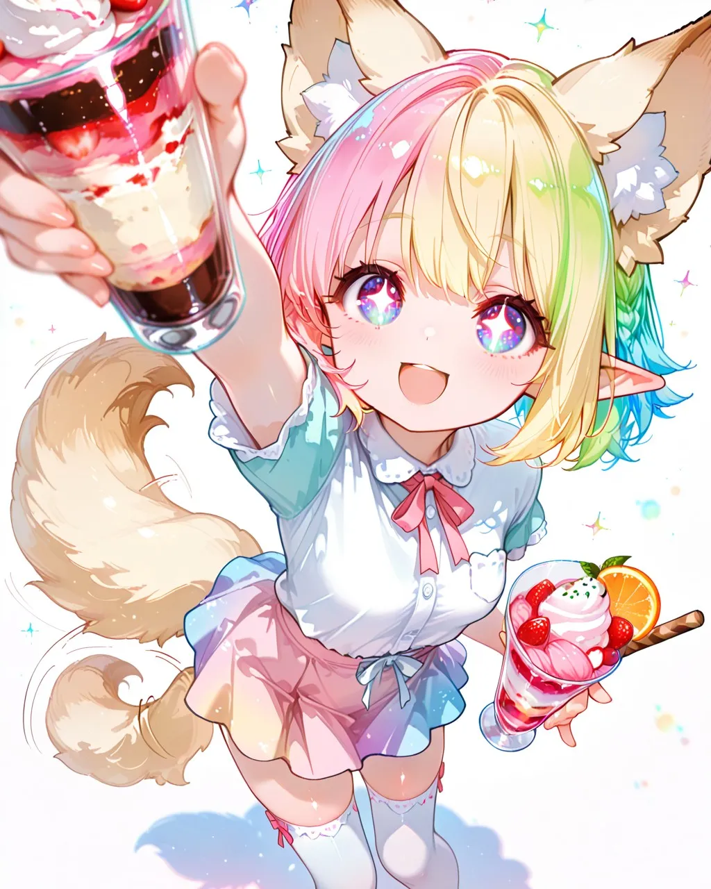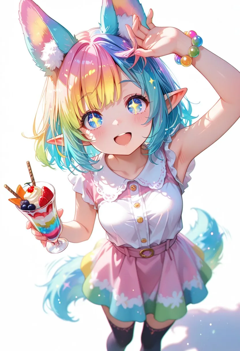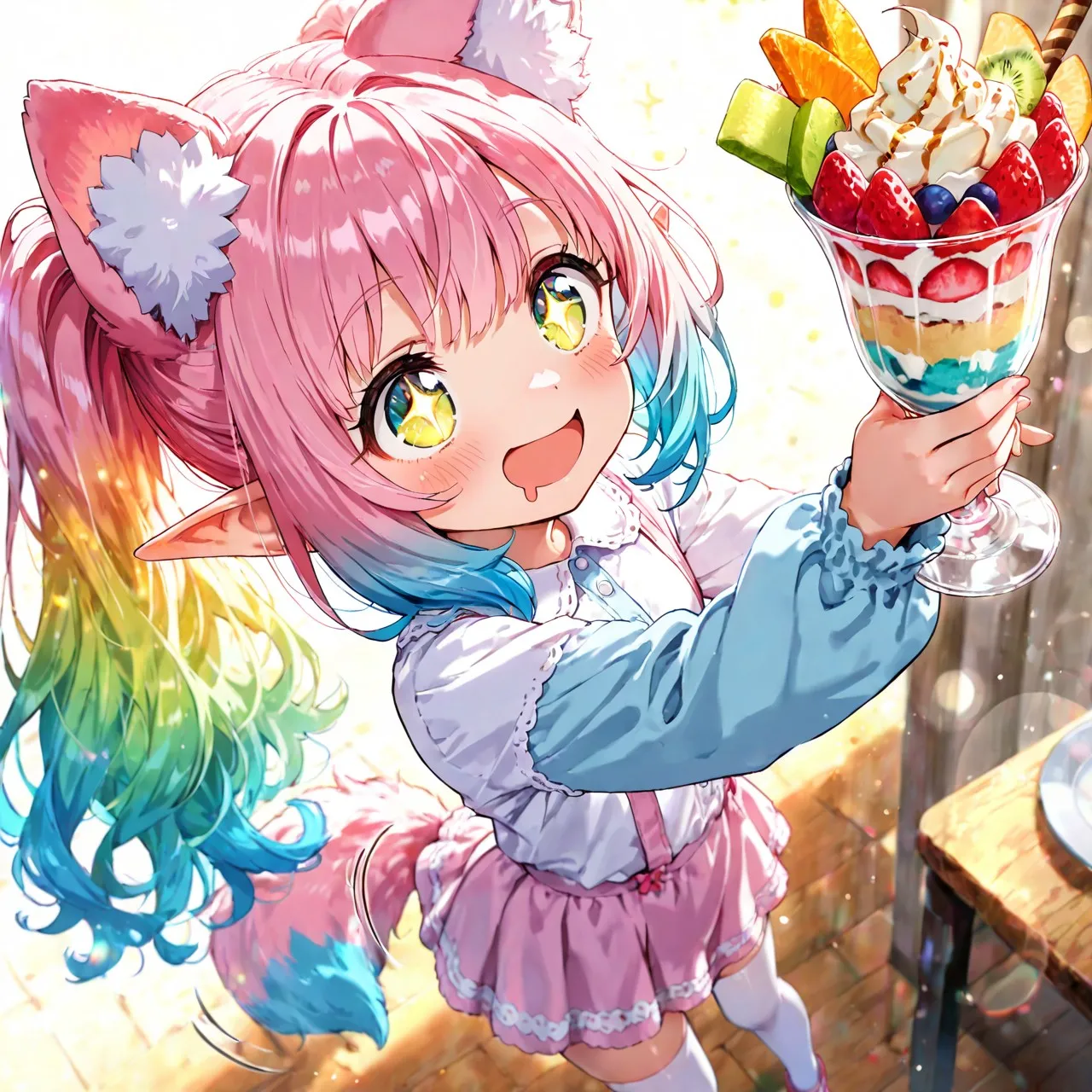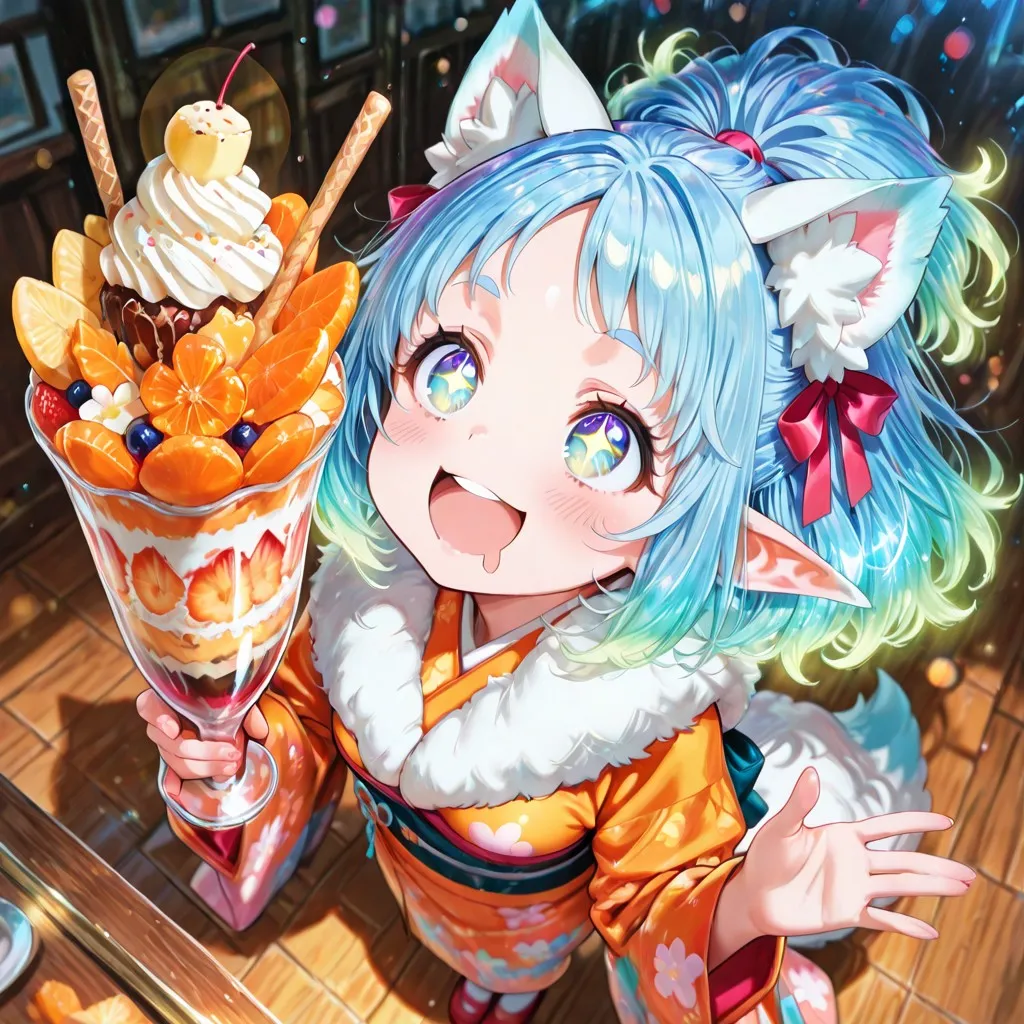 美味しそうなパフェを手にしてテンションが上がったケモ耳エルフさん