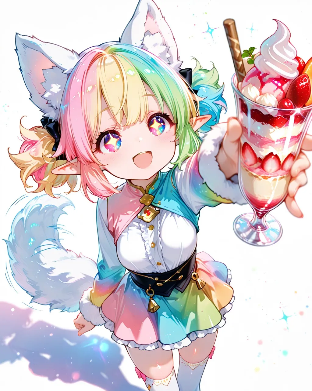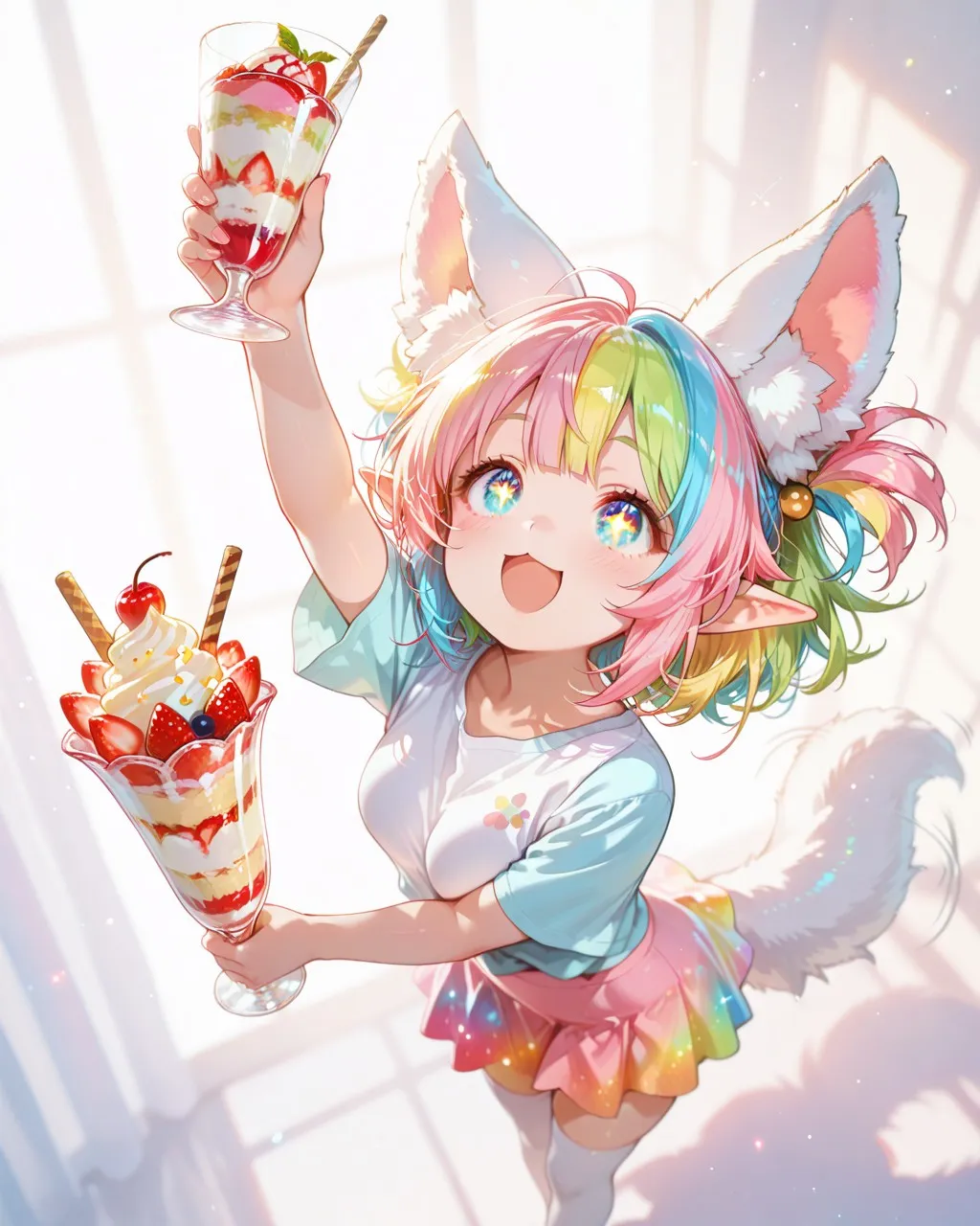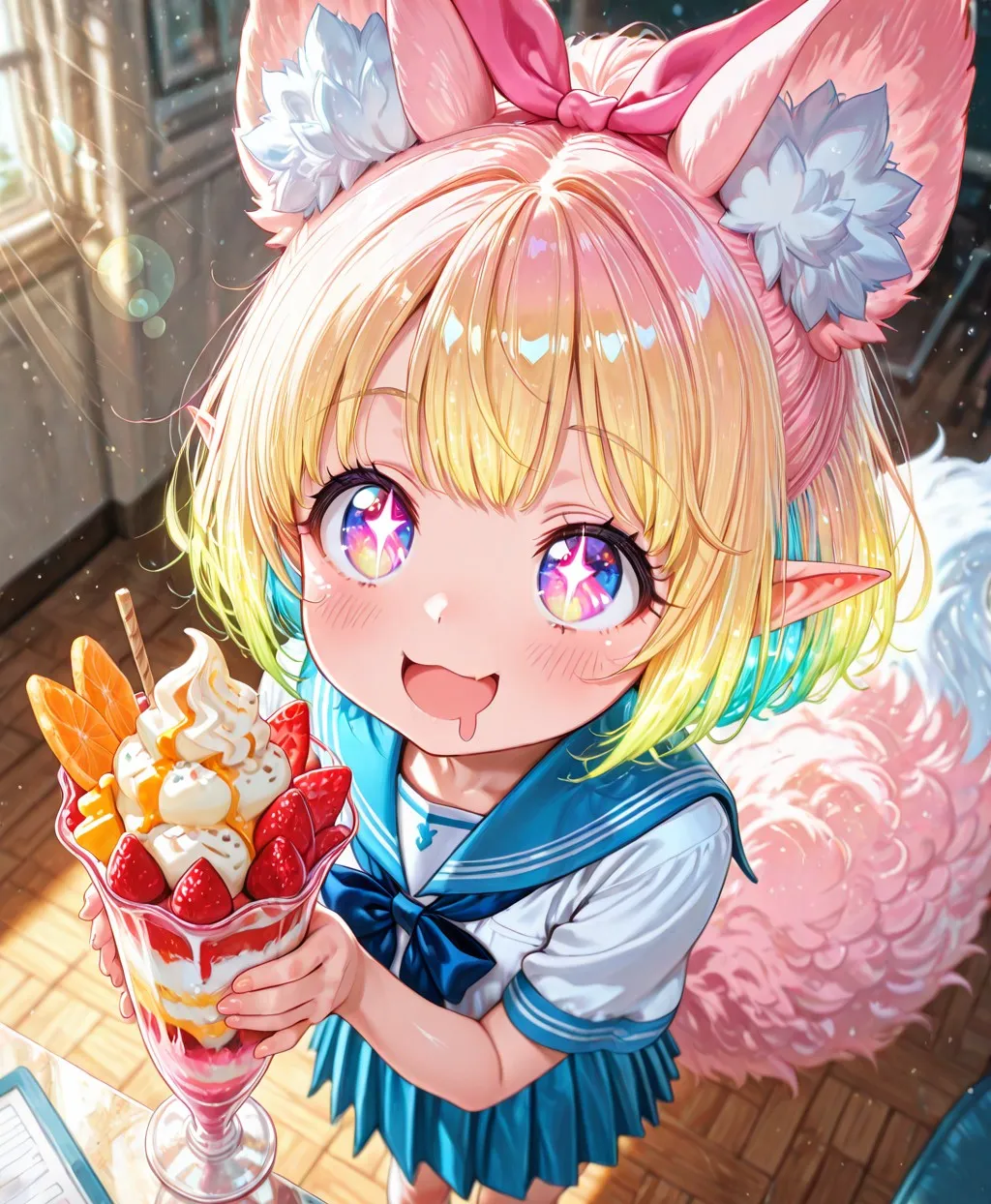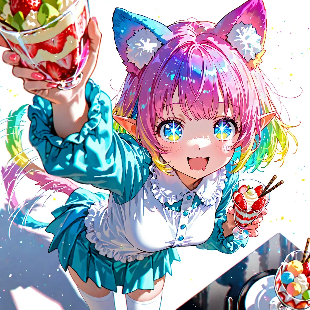 美味しそうなパフェを手にしてテンションが上がったケモ耳エルフさん