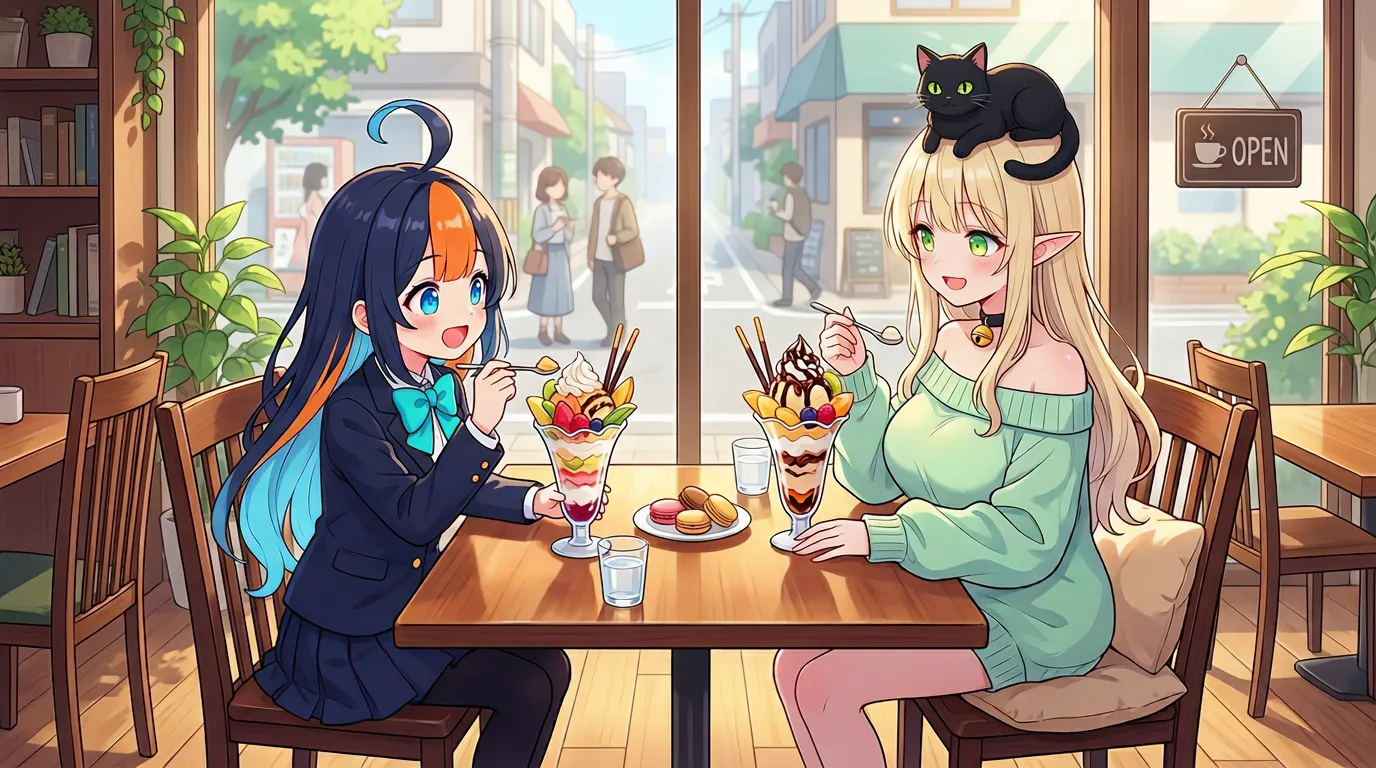 ぴ「エルフさんと一緒に、とっておきのパフェを食べに来たよ!」