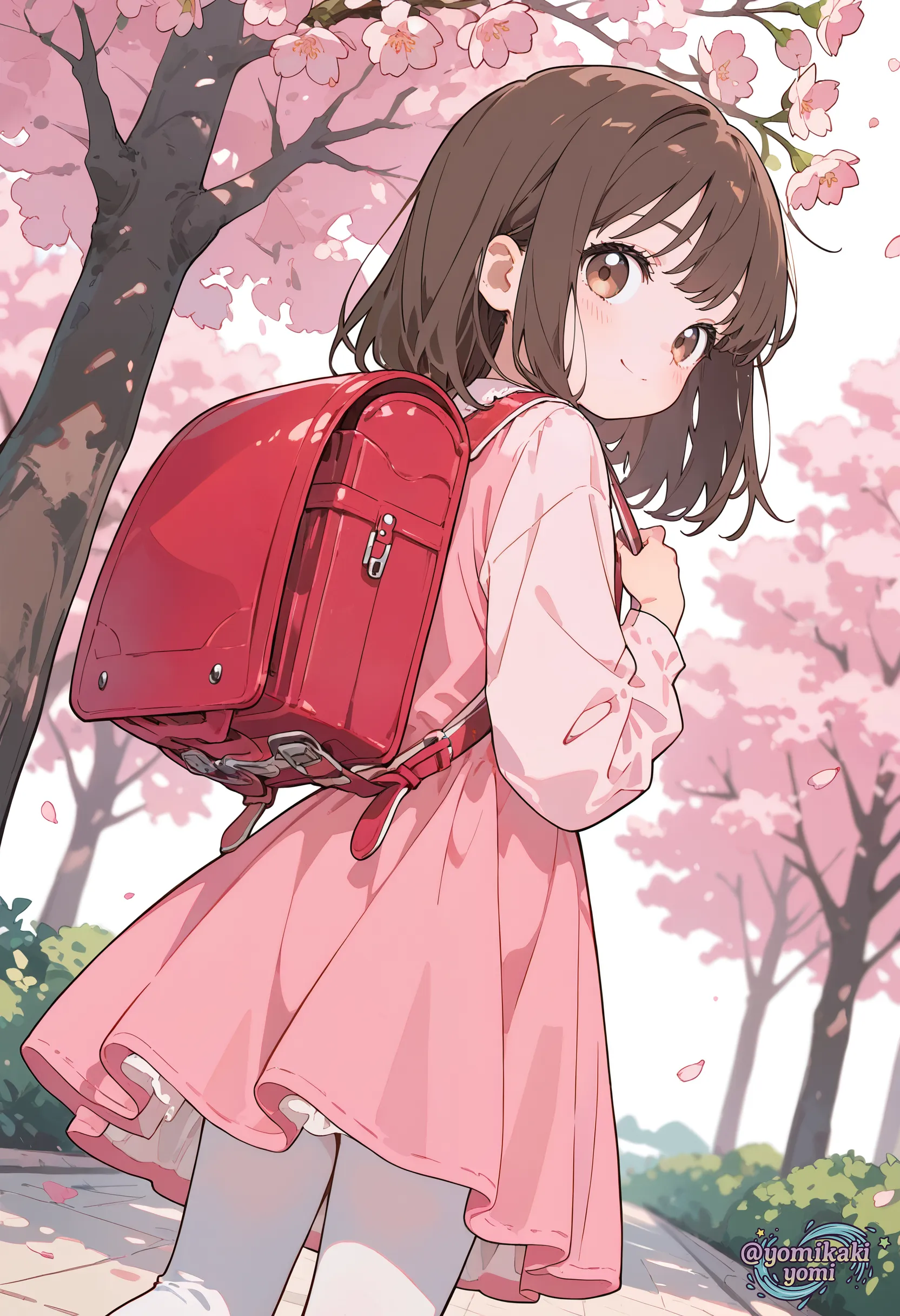 桜とピンクのワンピースが合っていて素敵ですね☺️ ランドセルは描写が難しいですが、綺麗に描写されていてすごいと思いました😳