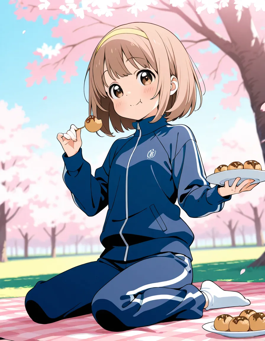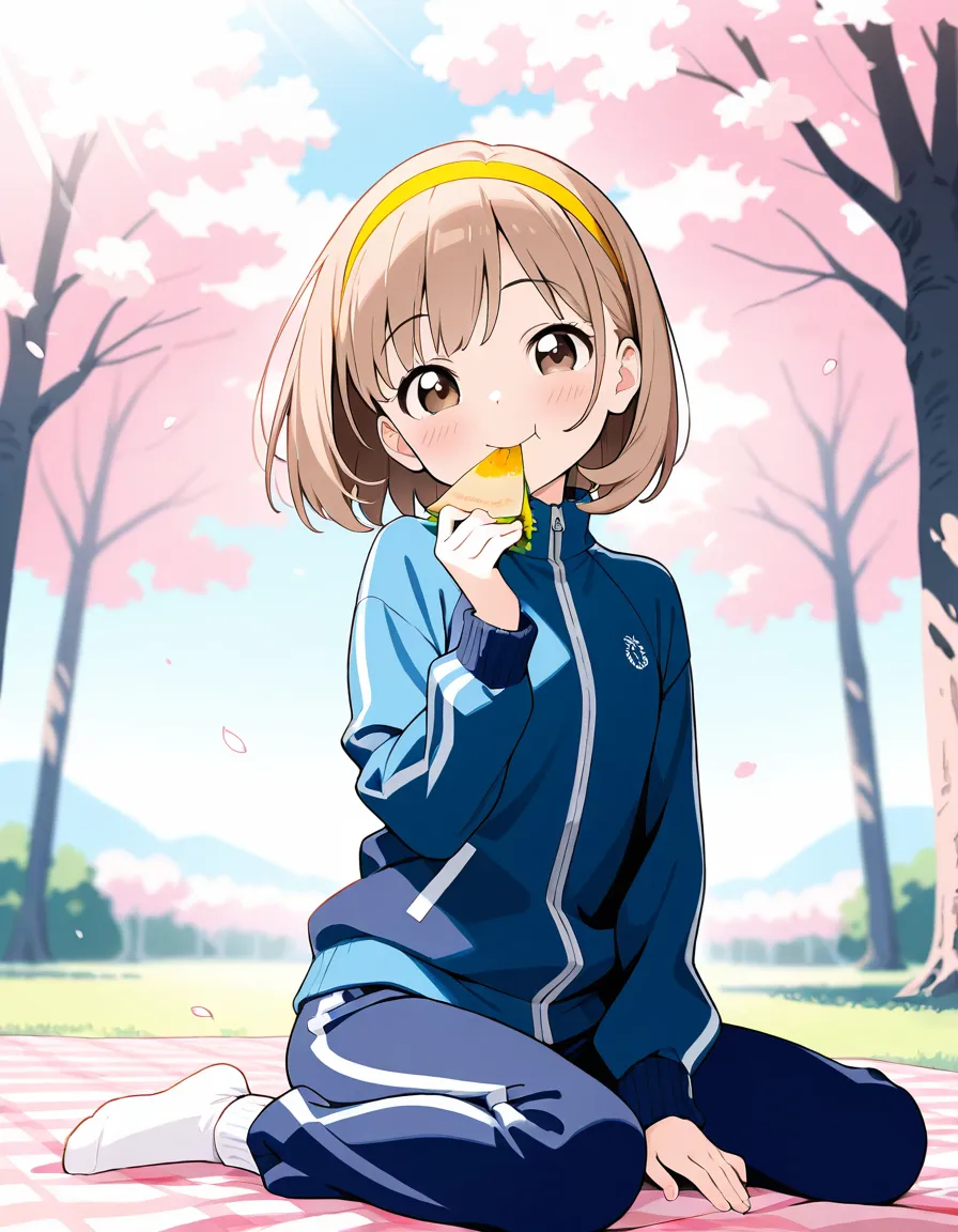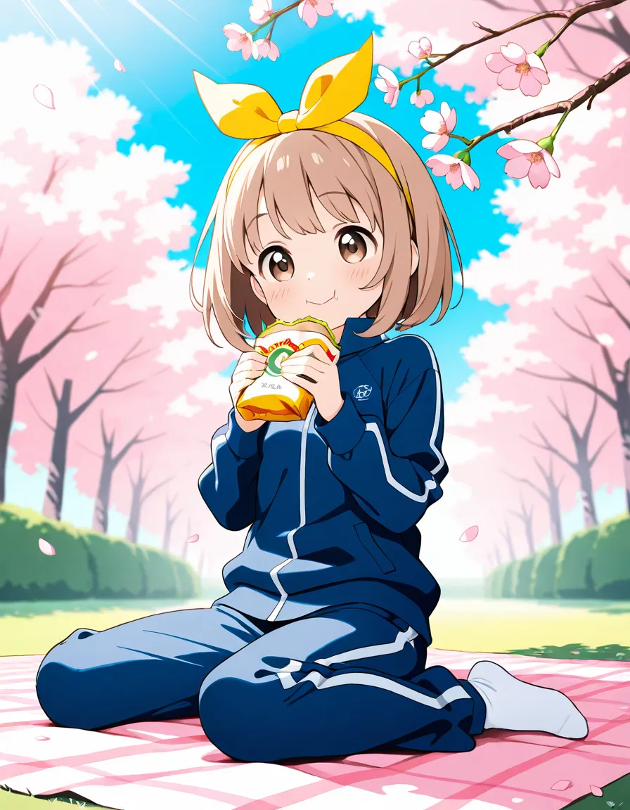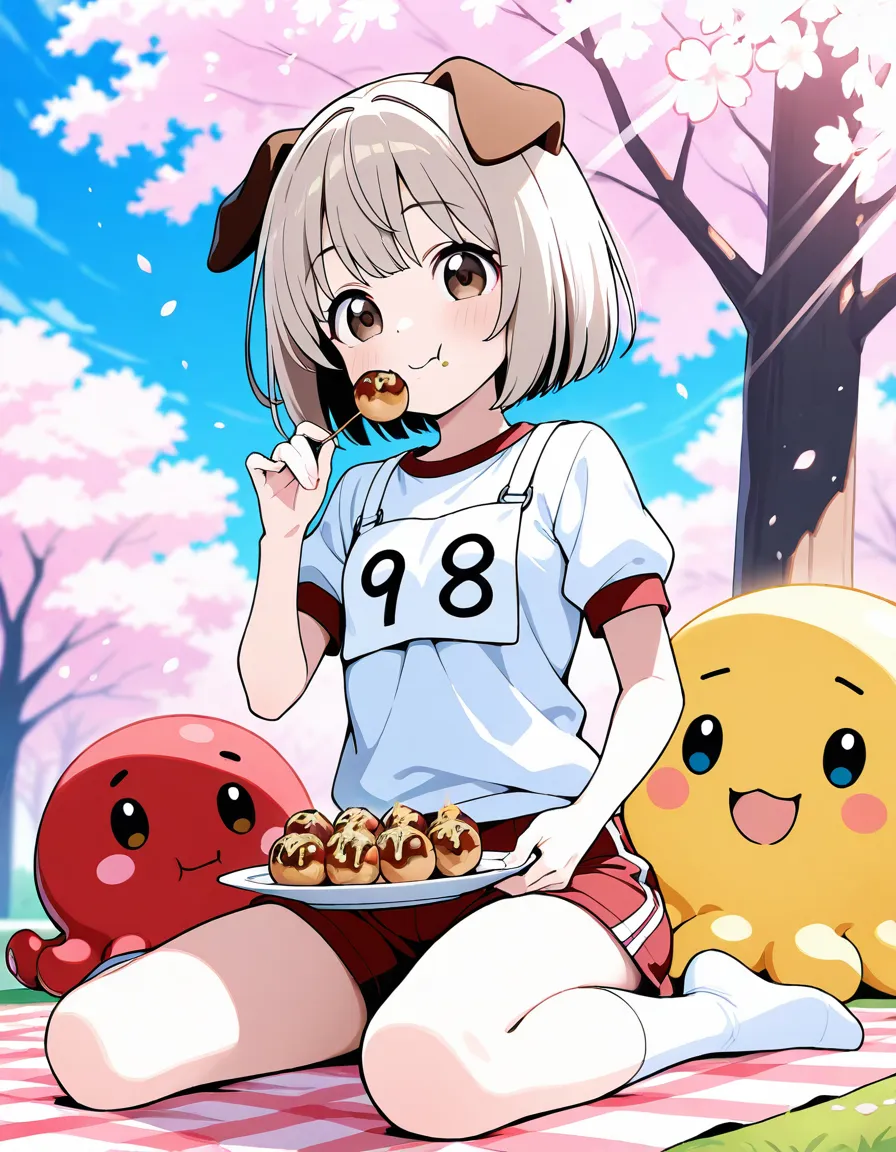 parameters: ((Masterpiece)), ((top quality)), (ultra-detailed), animated style illustration, ((solo)), 1girl, (dog girl), (10yo girl), (pretty little girl:1.3), (detailed face), (beautiful brown eyes), (beautiful pale khaki hair:1.3), (short hair:1.2), (Slightly longer droopy dog ears:1.5), small breast, (sporty outfit), shorts, (joyful smilie:1.3), :d, (white socks), no shoes, (Sitting on a picnic sheet under a cherry tree), wariza, (eating a Tacos:1.5), (happy smile:1.3), open mouth, (Octopus mascot doll on a picnic sheet:1.1), warm color palette, detailed background, cozy atmosphere, (Cherry blossoms in full bloom in background), cheerful mood, blue sky, bright sunlight, dramatic lighting, depth of field, school gym uniform, short sleeves, number bib, dynamic composition.