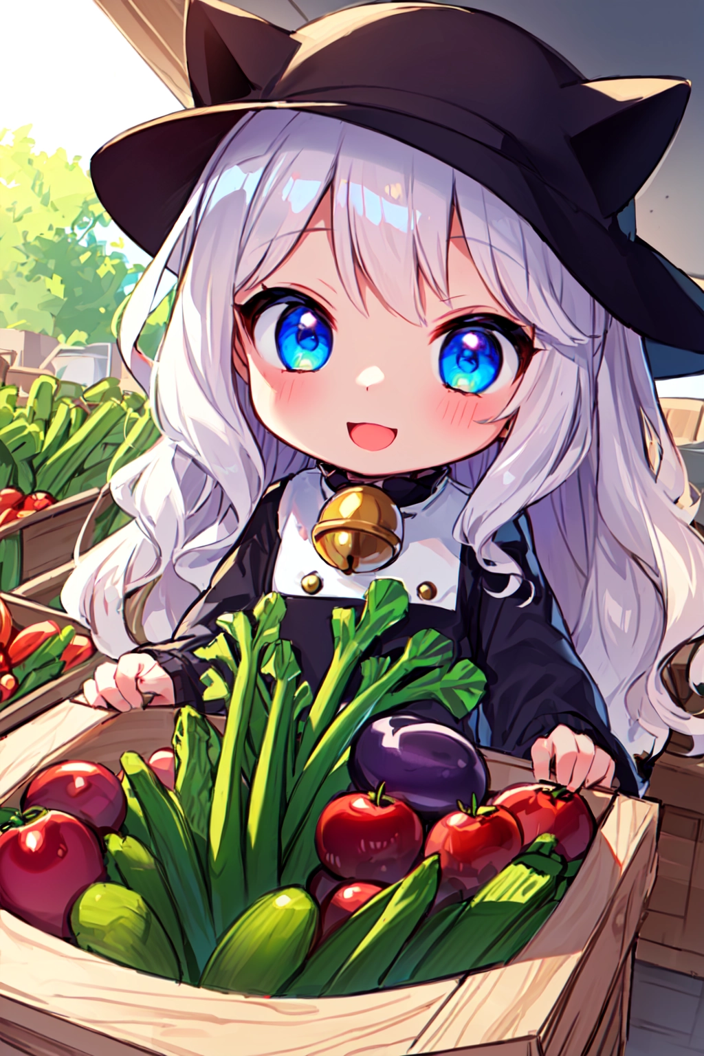 Girl exploring bustling summer vegetable market, stalls brimming with fresh tomatoes, eggplants, bell peppers, zucchinis, and corn, vendors offering samples, sun hats, baskets full of produce, lively chatter, vibrant colors contrasting against wooden stalls, warm sunlight filtering through.